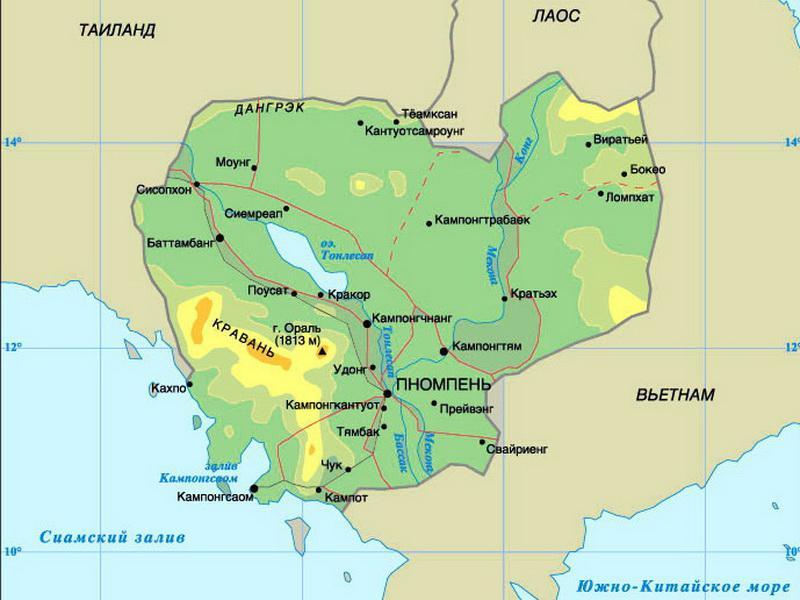 Королівство Камбоджа – це держава у Південно-Східній Азії, на півдні півострова Індокитай. Площа країни – близько 181 тис. кв. км., межує на півночі з Лаосом, на північному заході - з Таїландом, на сході та південному сході - з В'єтнамом, на південному заході омивається водами Сіамської затоки