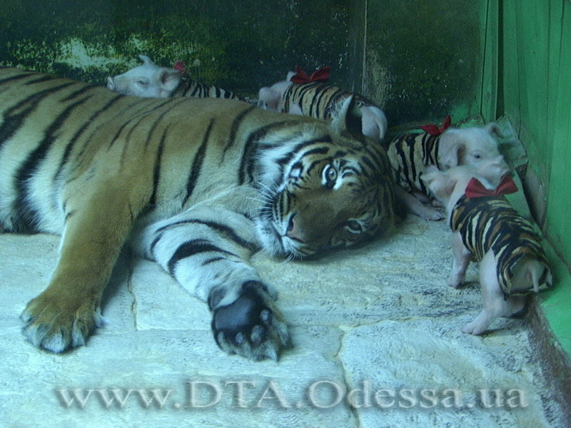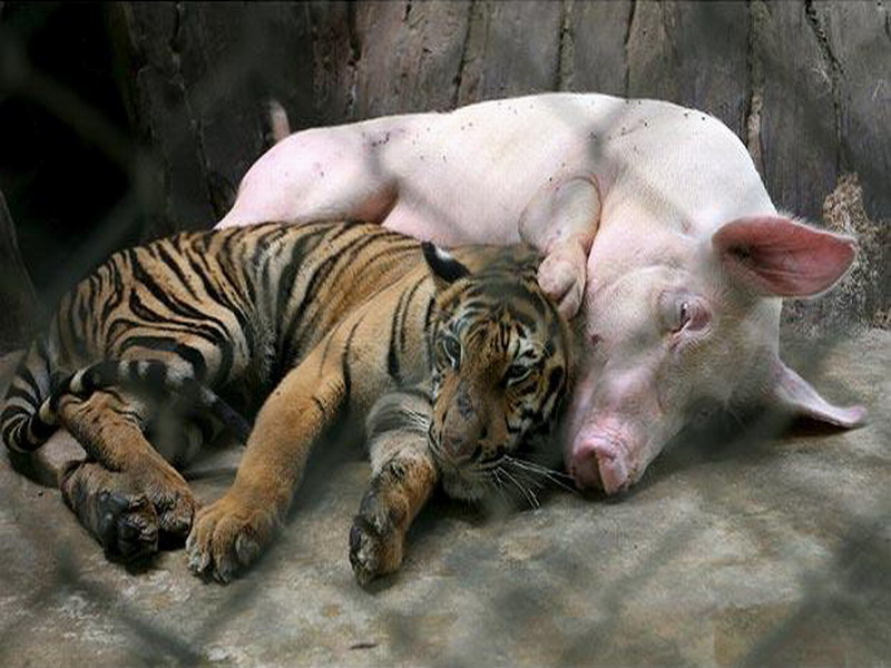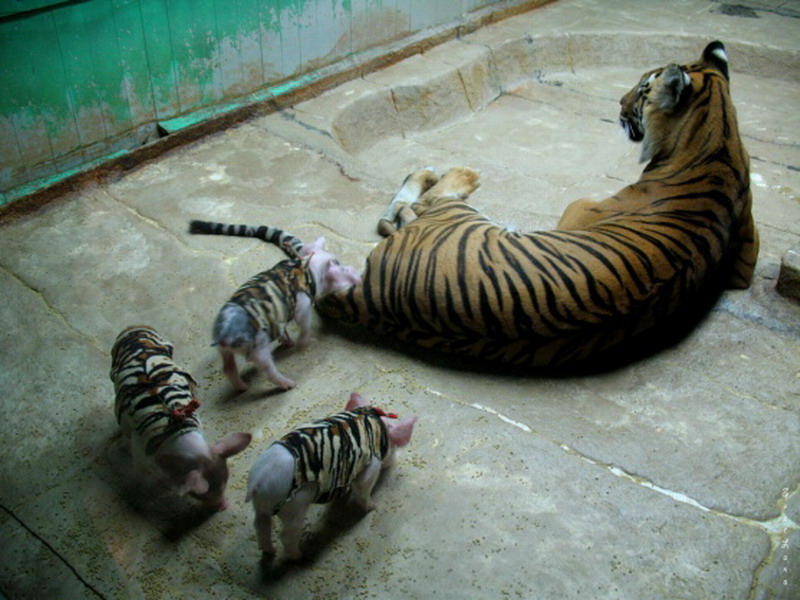 Там же можно увидеть жизнь необычной семьи, состоящей из собаки, свиньи, петуха и тигра