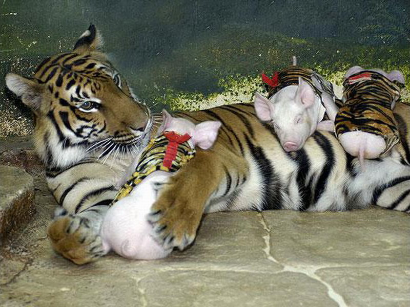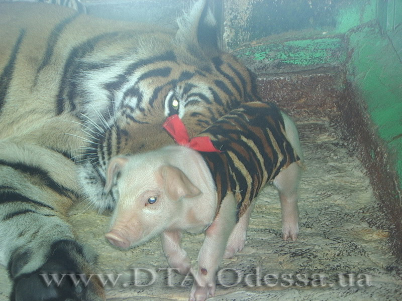 Там же можно увидеть жизнь необычной семьи, состоящей из собаки, свиньи, петуха и тигра